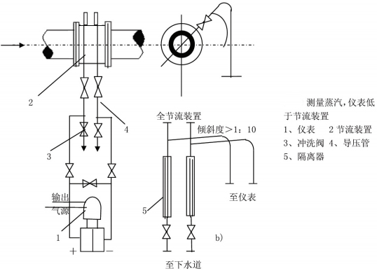 丈量蒸汽流量時,裝置方式普通為差壓變送器低于、高于節流安裝兩種。取壓口位置應附合上述裝置請求,并在導壓管制高點處裝上放氣閥和氣體搜集器。