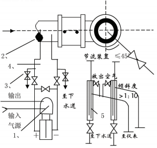丈量介質為清潔的氣體流量時,裝置方式普通為差壓變送器高于、低于節流安裝兩種取壓口位置應契合上述裝置請求,當差壓變送器低于節流 安裝時,導壓管必需向下彎至差壓變送器,并在*低處安裝放水閥和堆積器。