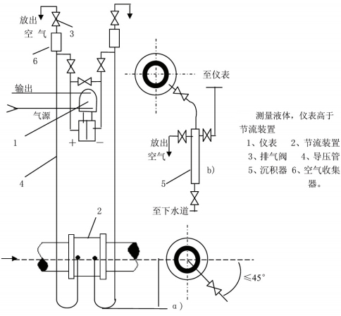 丈量液體流量時工藝管道程度裝置,差壓變送器的位置 處于節流安裝下方時,取壓口應在節流安裝的程度中心 軸線下偏45°角引出,這能夠消樣除由流體傳放出的氣體進入導壓管和差壓變送器。若差壓變送器處于節流安裝的上方時,除取壓口下偏<45°角然后向 上引導壓管外,應在導壓管 上的*高點安裝集器或排氣閥。